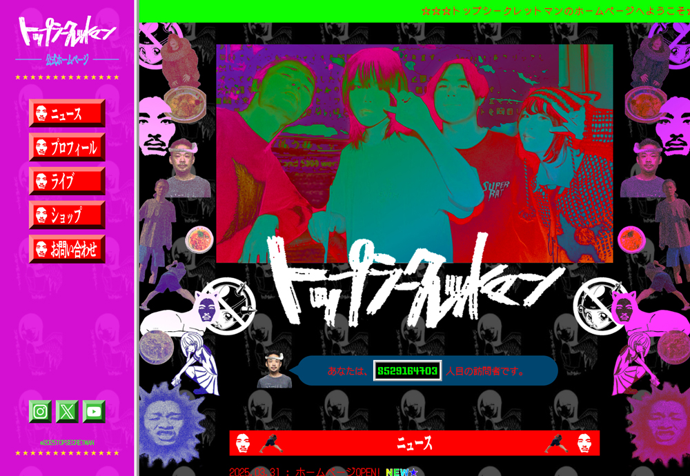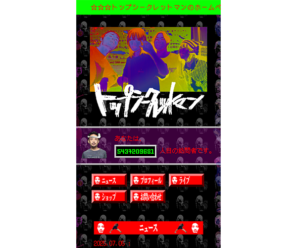 埼玉発のバンド・トップシークレットマンの公式HPを制作しました。 トップシークレットマンはネット発のカルチャーをクリエイティブに多用しており、そのバンドの個性を表現すべく、90年代テイストのホームページデザインを想起させるような遊び心溢れるサイトを目指しました。 日頃からさまざまなアーティストとコミュニケーションを取っているナターシャは、アーティストの魅力を盛り込んだ公式サイトの制作が可能です。